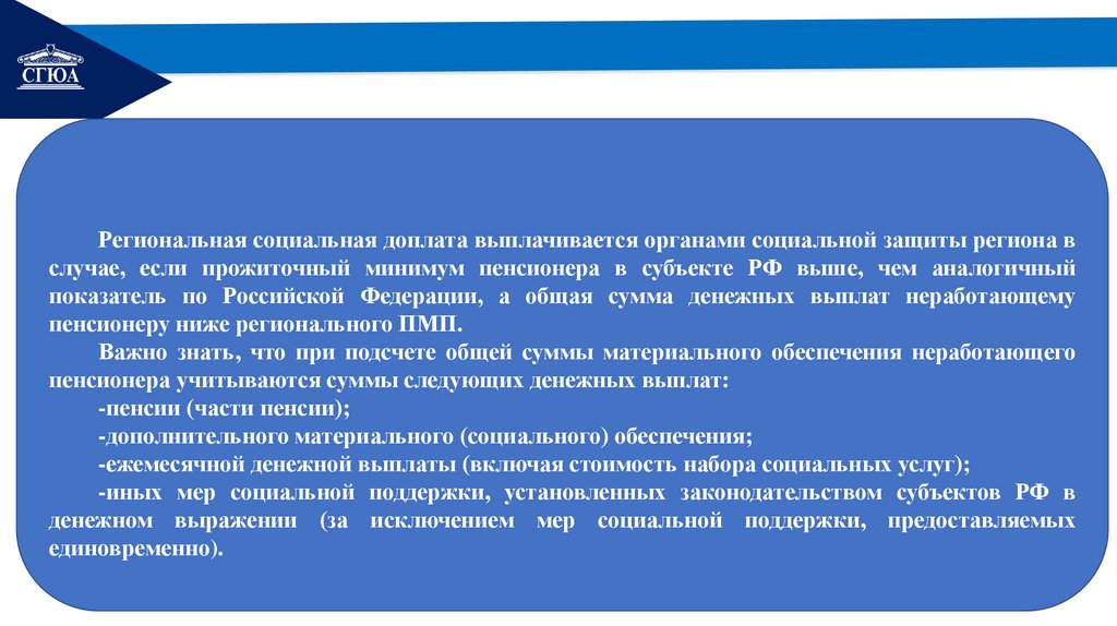 Региональная социальная доплата выплачивается органами социальной защиты региона вслучае, если прожиточный минимум пенсионера в субъекте РФ выше, чем аналогичный