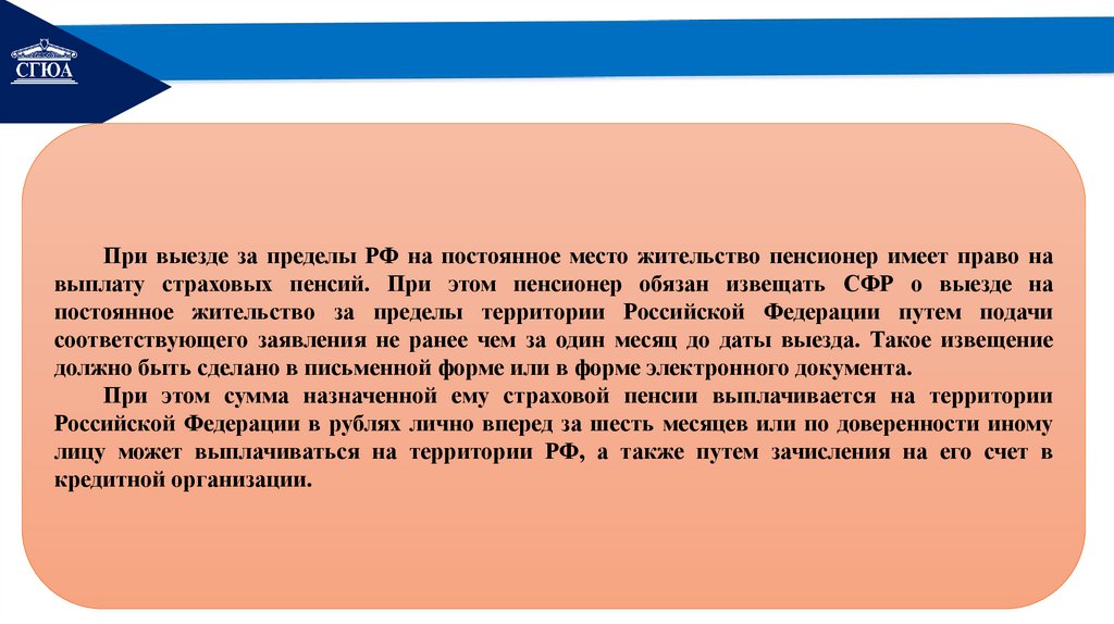 При выезде за пределы РФ на постоянное место жительство пенсионер имеет право навыплату страховых пенсий. При этом пенсионер обязан извещать СФР о выезде на