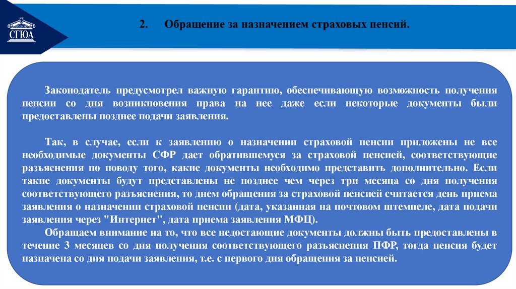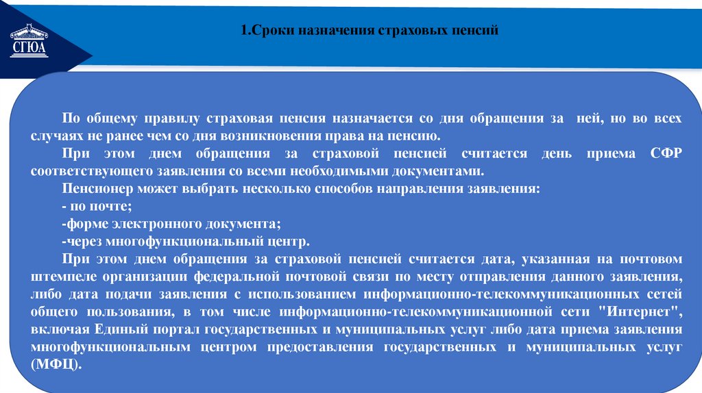 1.Сроки назначения страховых пенсийПо общему правилу страховая пенсия назначается со дня обращения за ней, но во всех