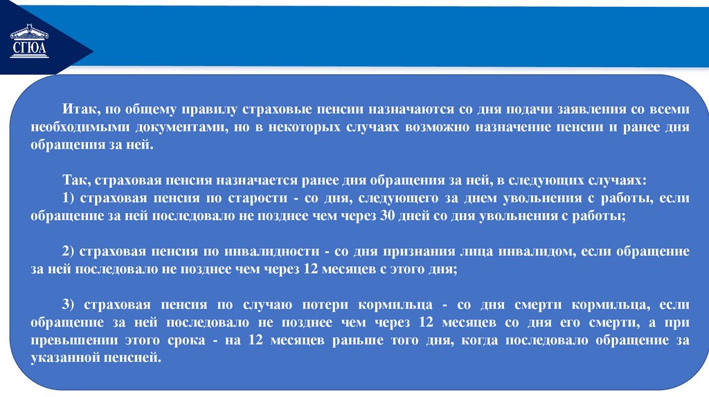 Итак, по общему правилу страховые пенсии назначаются со дня подачи заявления со всеминеобходимыми документами, но в некоторых случаях возможно назначение пенсии и ранее дня