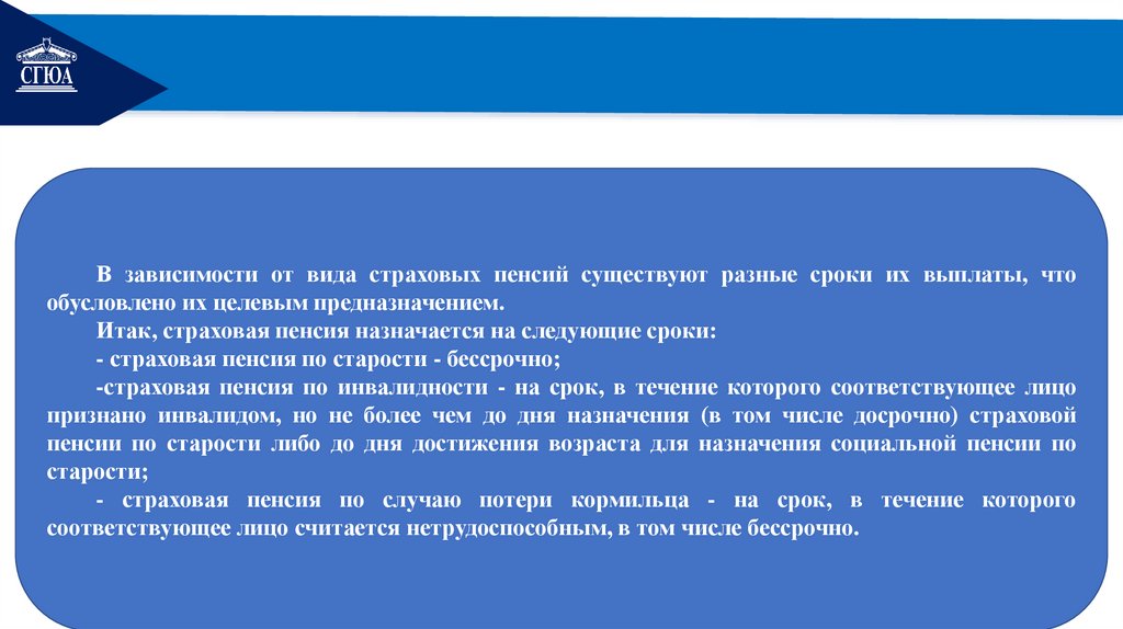 В зависимости от вида страховых пенсий существуют разные сроки их выплаты, чтообусловлено их целевым предназначением.