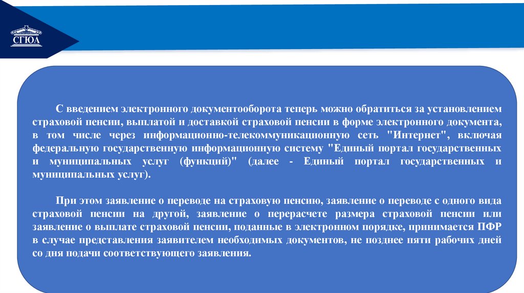 С введением электронного документооборота теперь можно обратиться за установлениемстраховой пенсии, выплатой и доставкой страховой пенсии в форме электронного документа,
