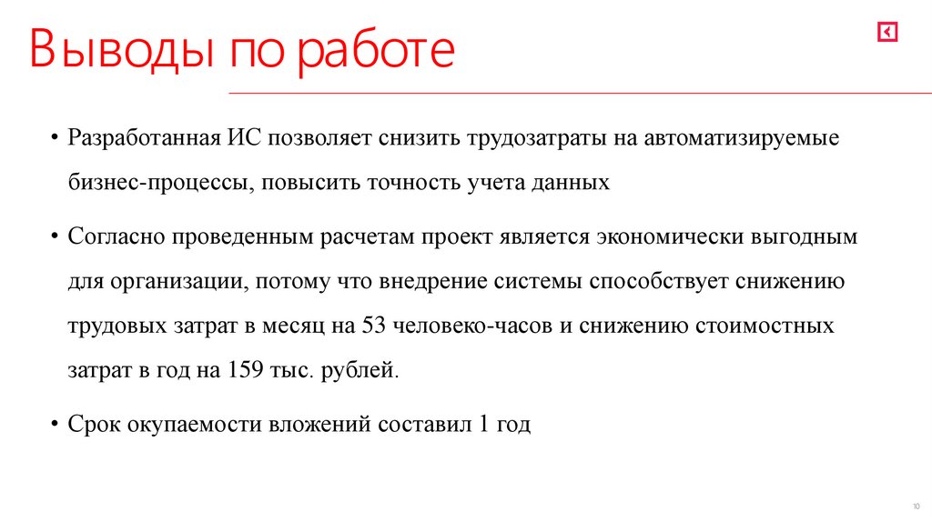 Выводы по работе• Разработанная ИС позволяет снизить трудозатраты на автоматизируемые