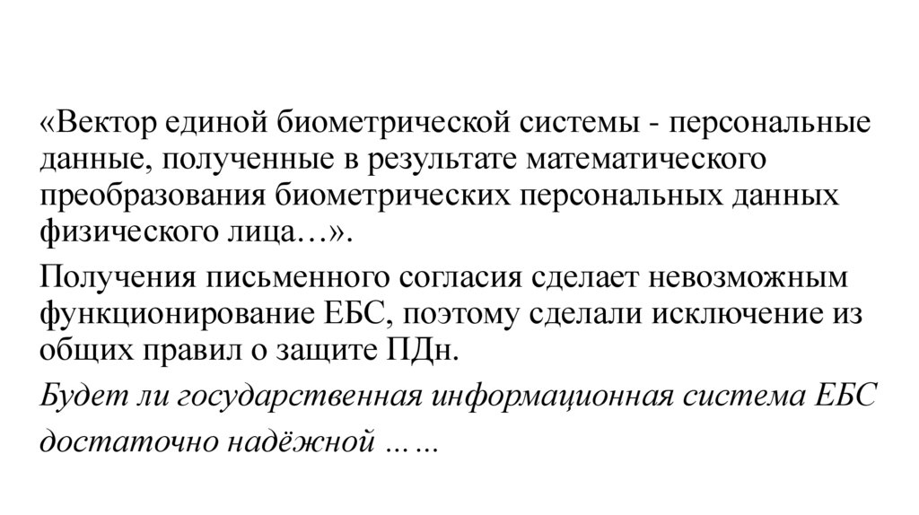 «Вектор единой биометрической системы - персональныеданные, полученные в результате математического
