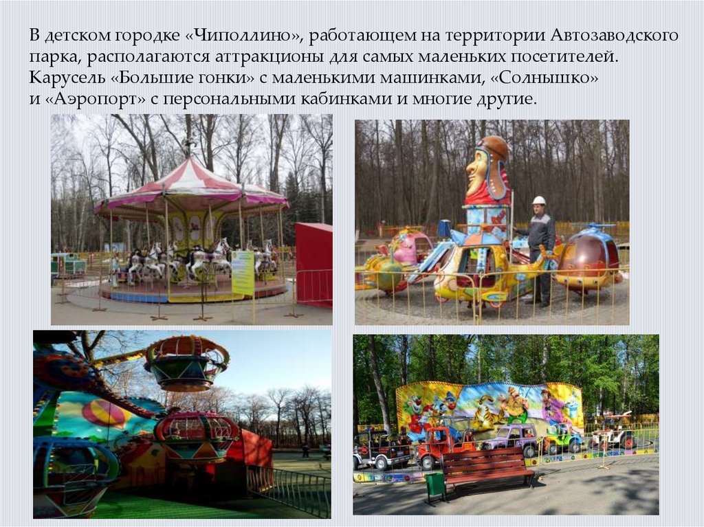 В детском городке «Чиполлино», работающем на территории Автозаводскогопарка, располагаются аттракционы для самых маленьких посетителей.