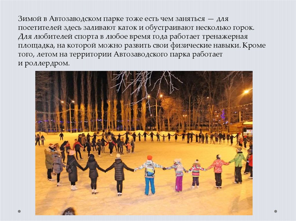 Зимой в Автозаводском парке тоже есть чем заняться — дляпосетителей здесь заливают каток и обустраивают несколько горок.