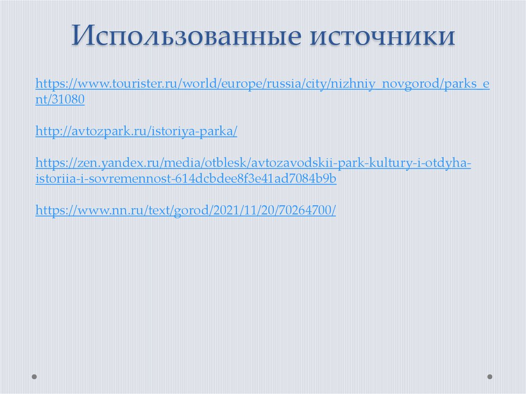 Использованные источникиhttps://www.tourister.ru/world/europe/russia/city/nizhniy_novgorod/parks_e