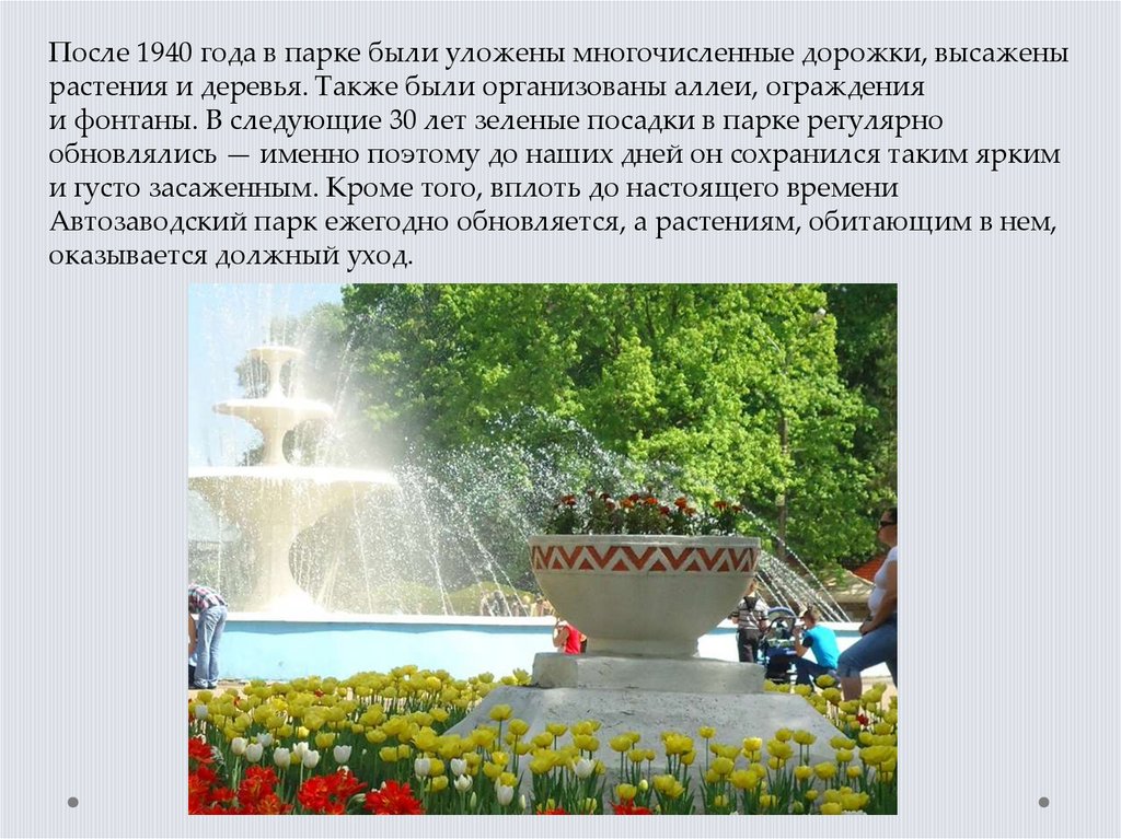 и фонтаны. В следующие 30 лет зеленые посадки в парке регулярно