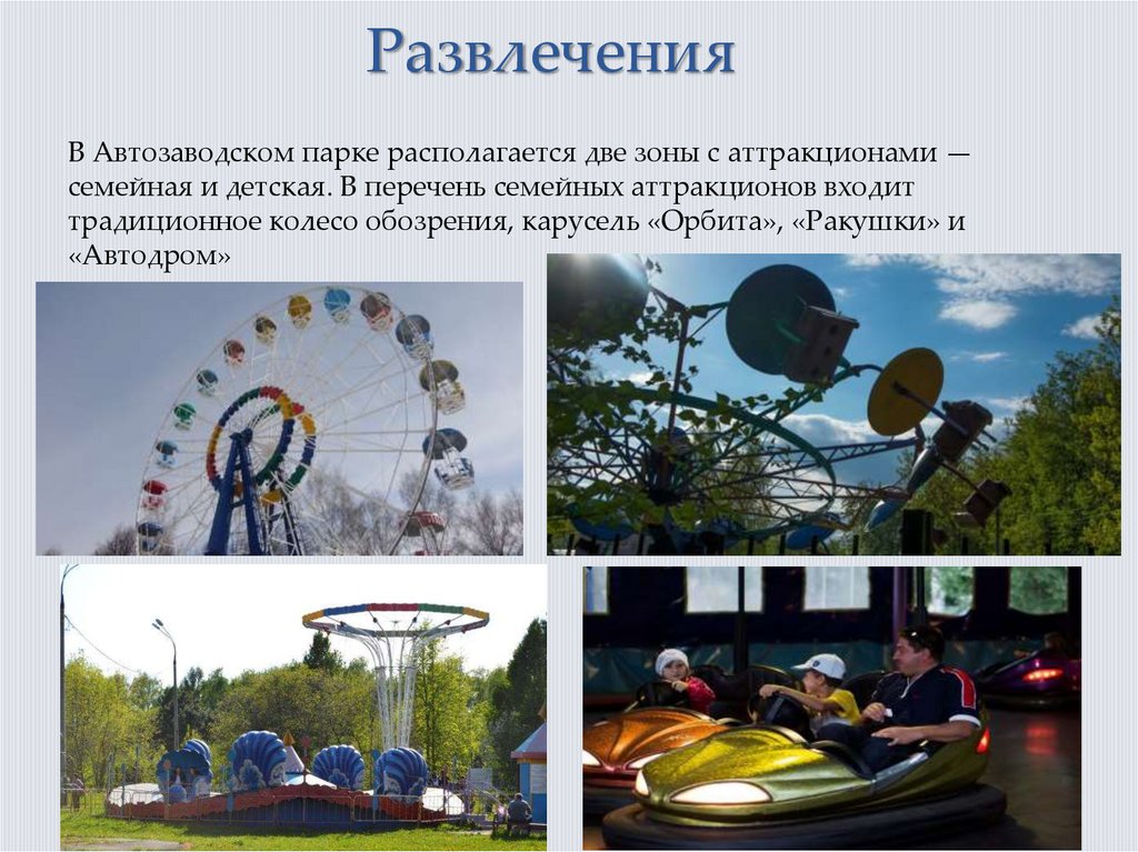 РазвлеченияВ Автозаводском парке располагается две зоны с аттракционами —