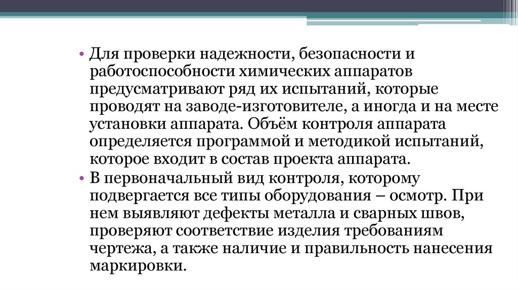 • Для проверки надежности, безопасности иработоспособности химических аппаратов