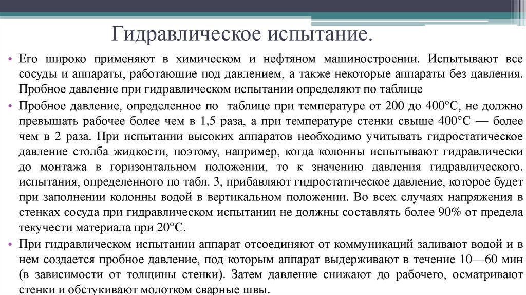 Гидравлическое испытание.• Его широко применяют в химическом и нефтяном машиностроении. Испытывают все