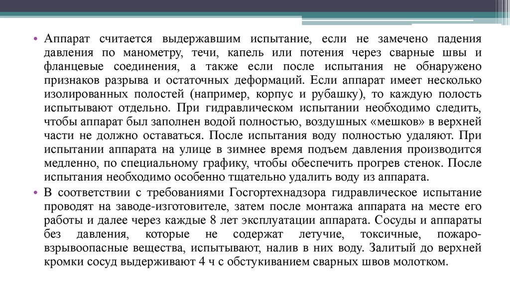 • При гидравлическом испытании аппарат отсоединяют от коммуникаций заливают водой и в