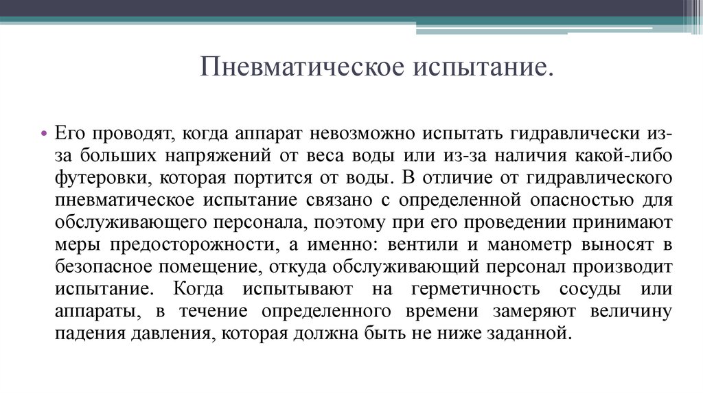 Пневматическое испытание.• Его проводят, когда аппарат невозможно испытать гидравлически изза больших напряжений от веса воды или из-за наличия какой-либо