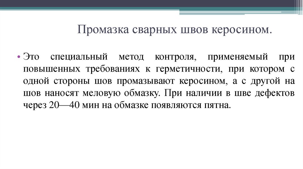 Промазка сварных швов керосином.• Это специальный метод контроля, применяемый при