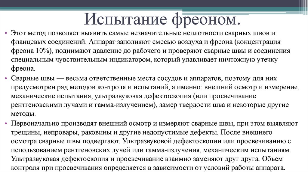 Испытание фреоном.• Этот метод позволяет выявить самые незначительные неплотности сварных швов и
