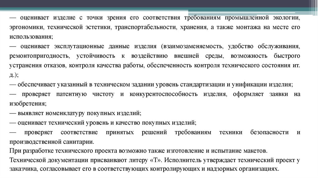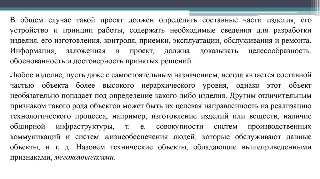 В общем случае такой проект должен определять составные части изделия, егоустройство и принцип работы, содержать необходимые сведения для разработки