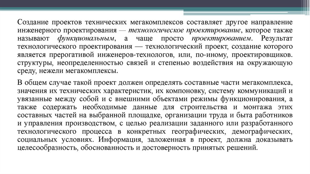 Создание проектов технических мегакомплексов составляет другое направлениеинженерного проектирования — технологическое проектирование, которое также