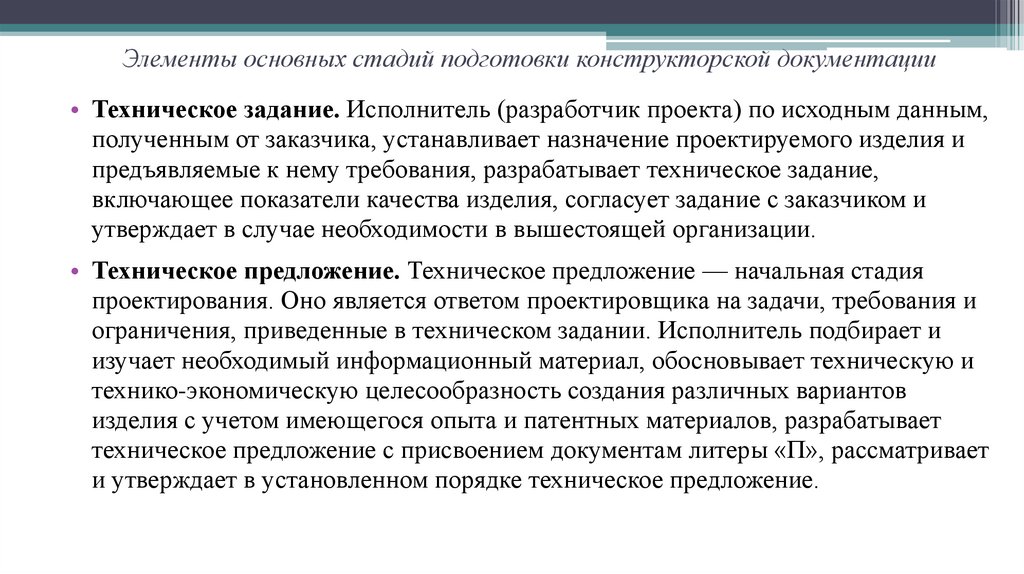 Элементы основных стадий подготовки конструкторской документации• Техническое задание. Исполнитель (разработчик проекта) по исходным данным,