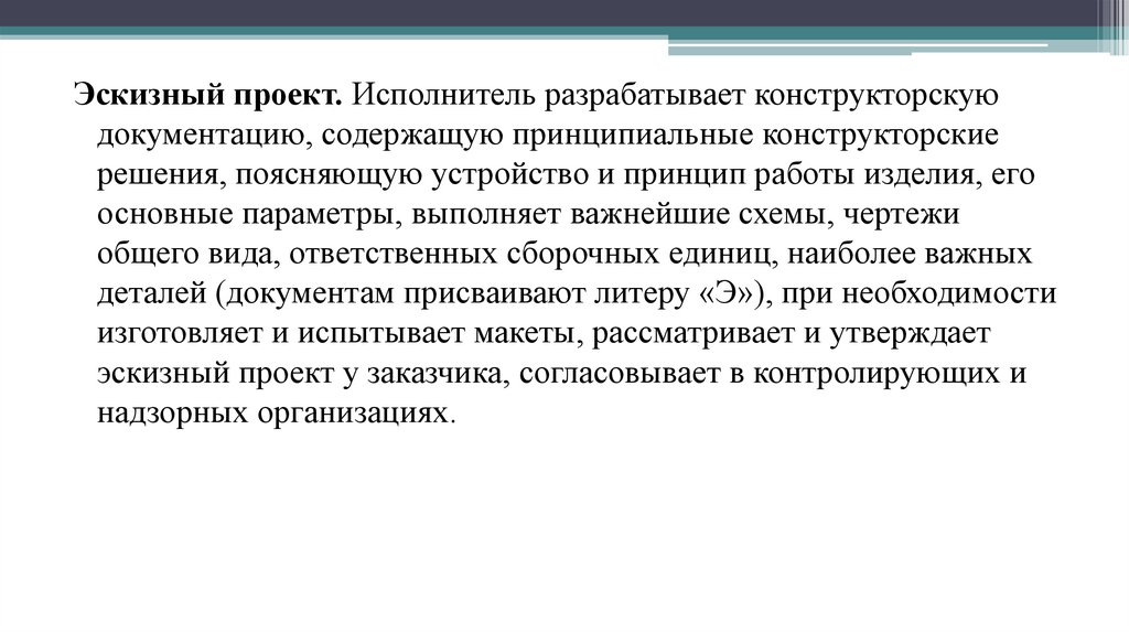 Эскизный проект. Исполнитель разрабатывает конструкторскуюдокументацию, содержащую принципиальные конструкторские