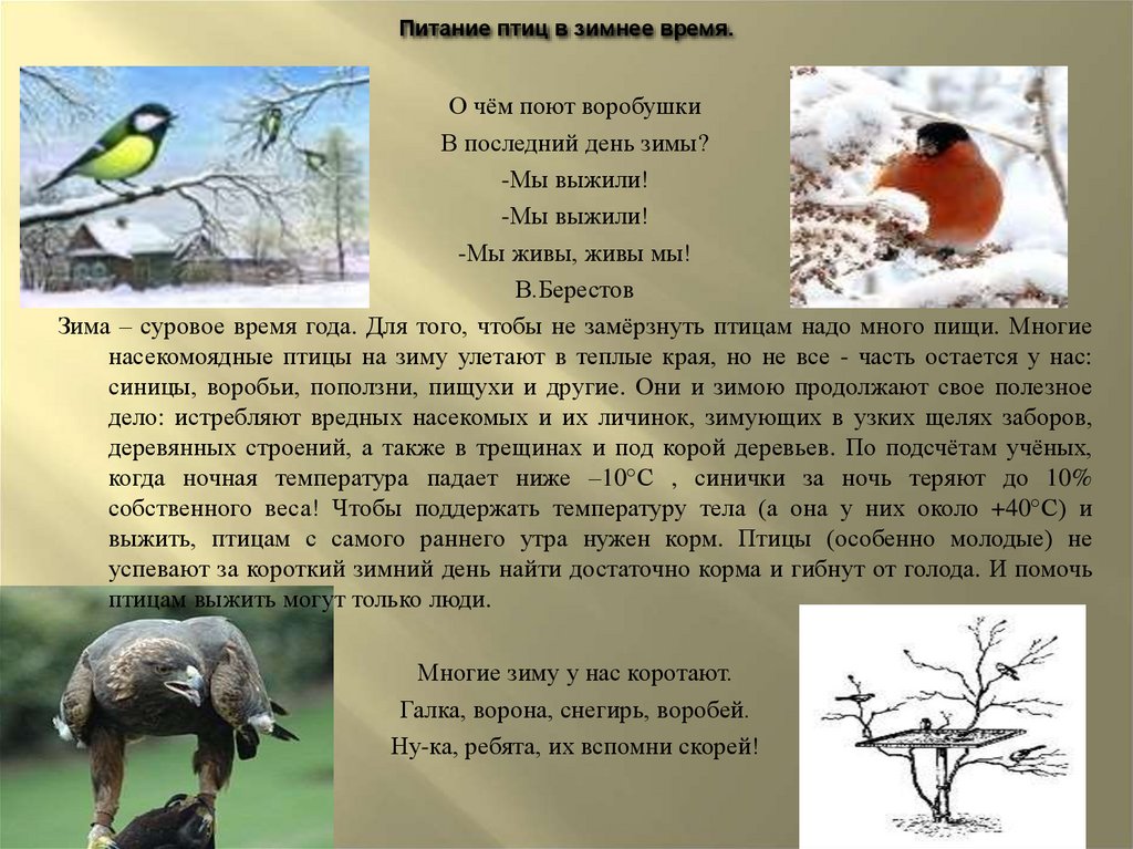 Зима – суровое время года. Для того, чтобы не замёрзнуть птицам надо много пищи. Многие