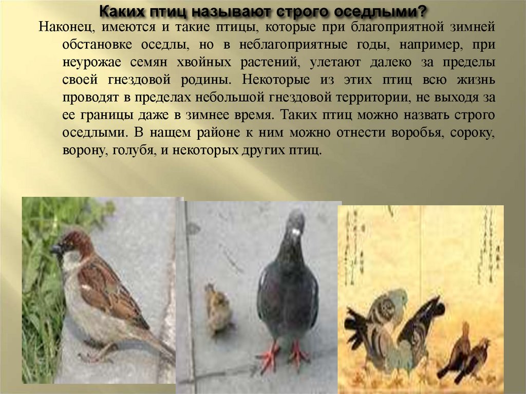 Каких птиц называют оседлые?Но есть птицы, которые круглый год находят на родине подходящие