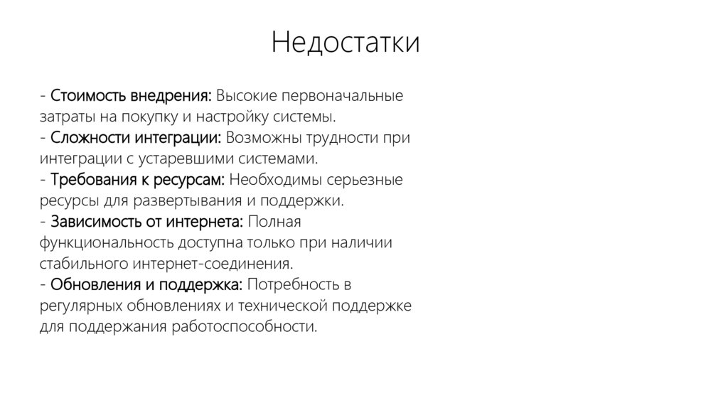 - Стоимость внедрения: Высокие первоначальныезатраты на покупку и настройку системы.