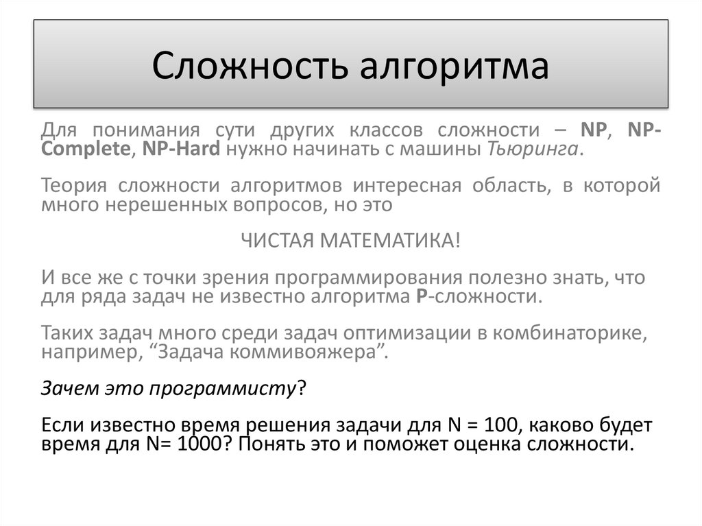 Сложность алгоритмаДля понимания сути других классов сложности – NP, NPComplete, NP-Hard нужно начинать с машины Тьюринга.