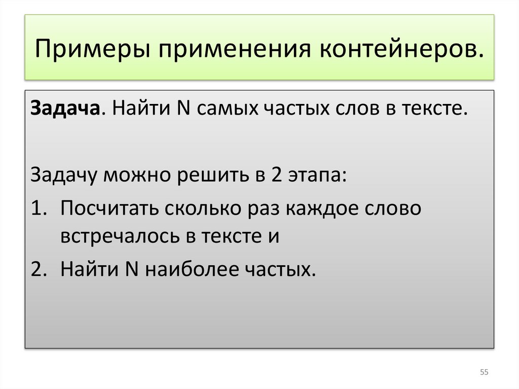 Примеры применения контейнеров.Задача. Найти N самых частых слов в тексте.