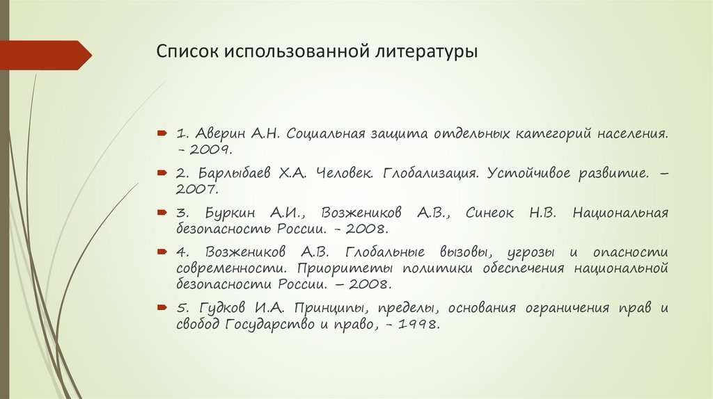 Список использованной литературы1. Аверин А.Н. Социальная защита отдельных категорий населения.