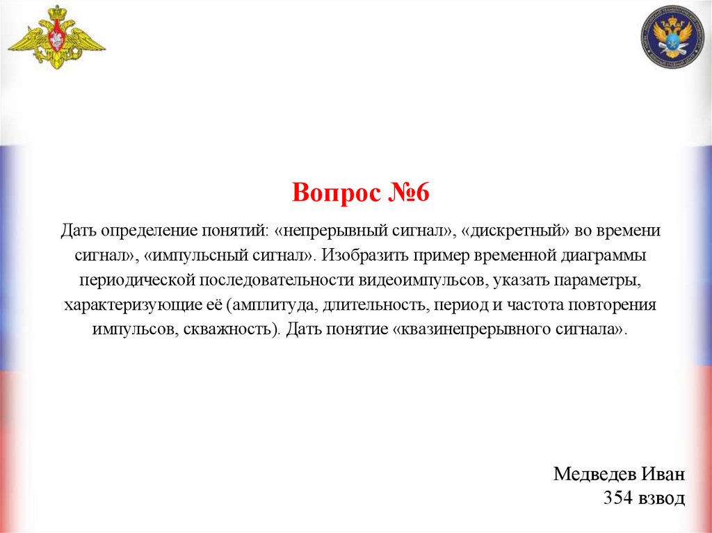 Вопрос №6Дать определение понятий: «непрерывный сигнал», «дискретный» во времени