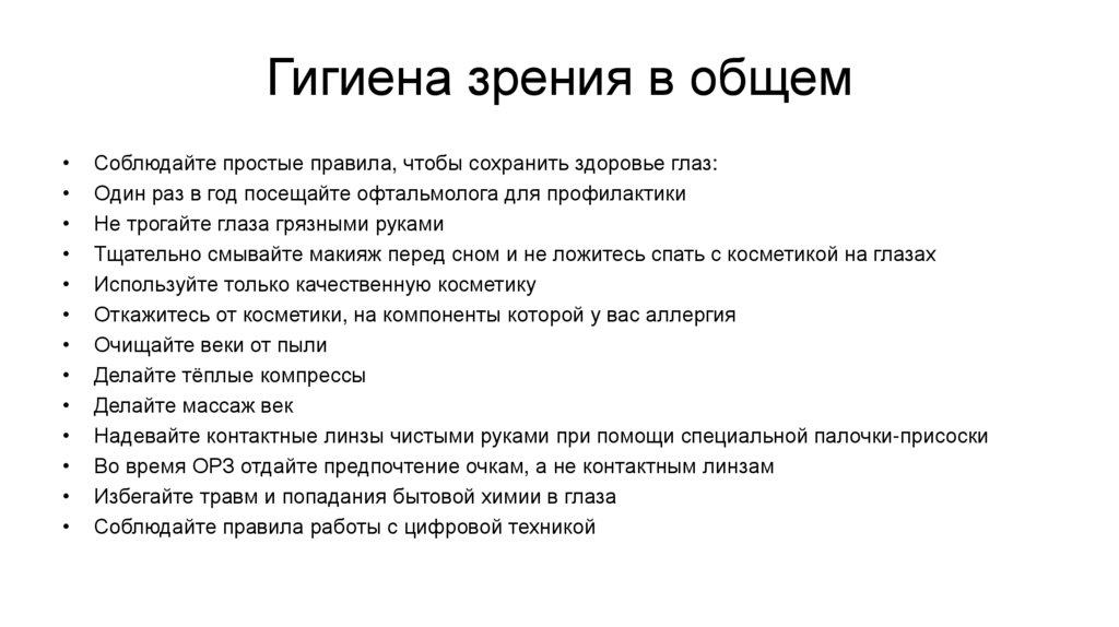 Гигиена зрения в общемСоблюдайте простые правила, чтобы сохранить здоровье глаз: