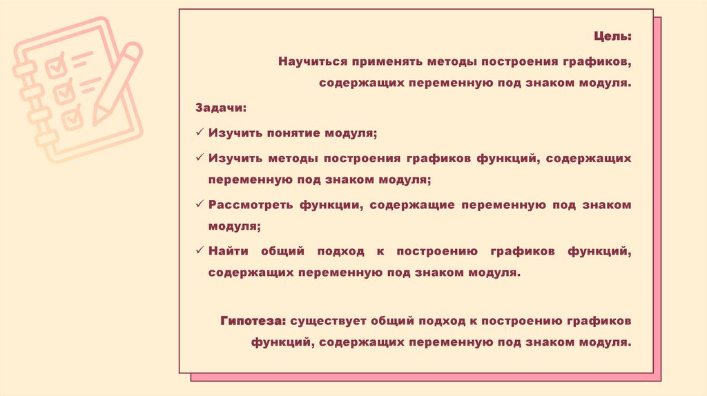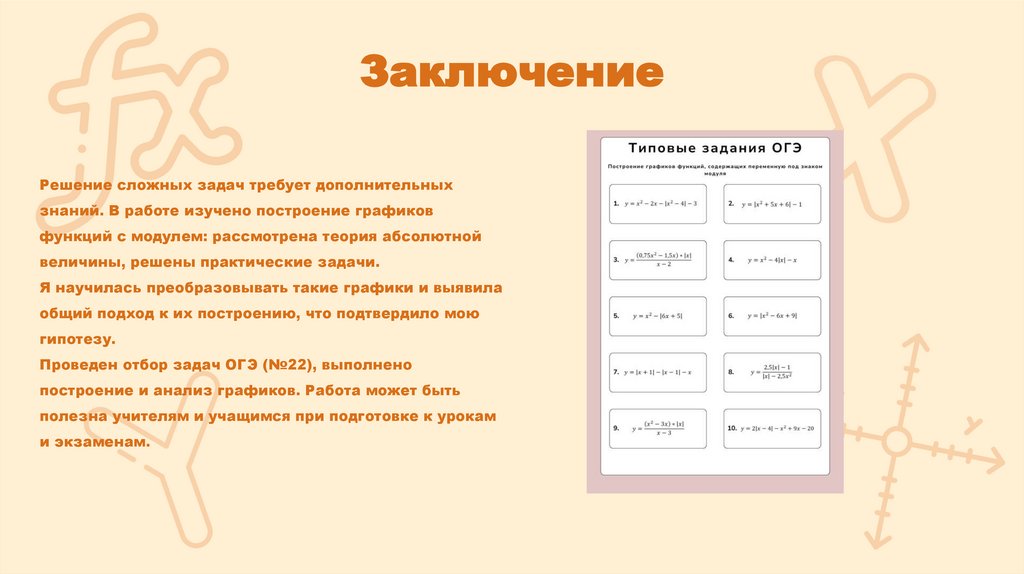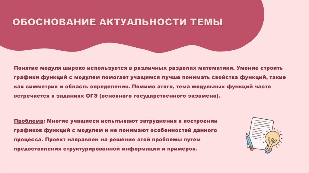 Понятие модуля широко используется в различных разделах математики. Умение строитьграфики функций с модулем помогает учащимся лучше понимать свойства функций, такие