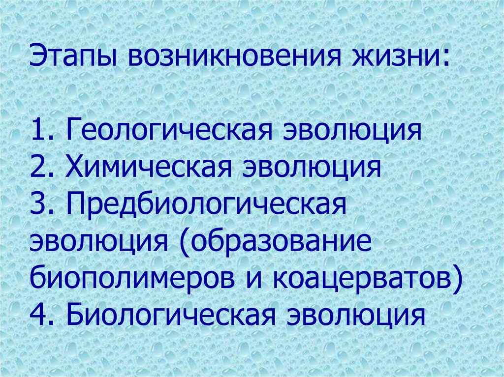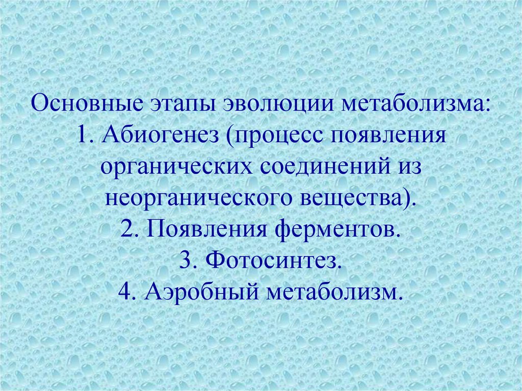 Основные этапы эволюции метаболизма:1. Абиогенез (процесс появления