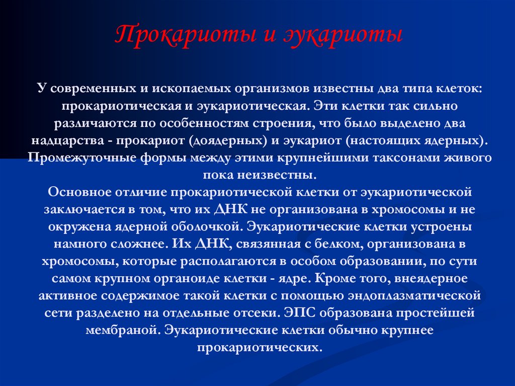 Прокариоты и эукариотыУ современных и ископаемых организмов известны два типа клеток: