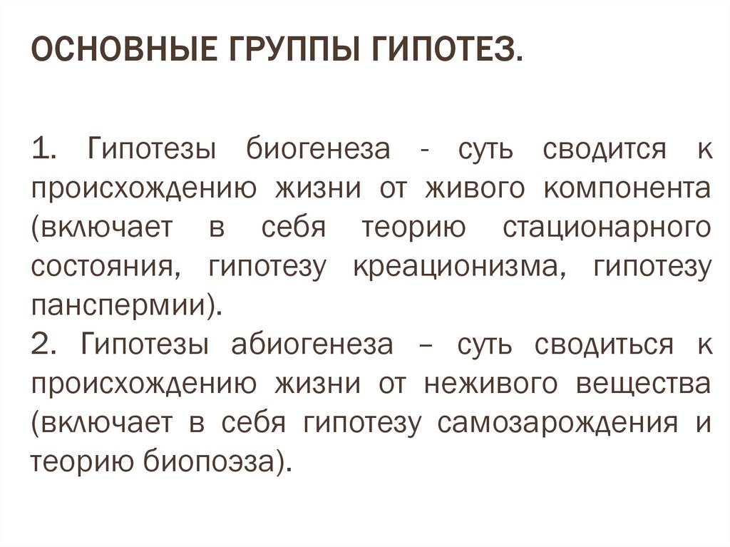 ОСНОВНЫЕ ГРУППЫ ГИПОТЕЗ.1. Гипотезы биогенеза - суть сводится к