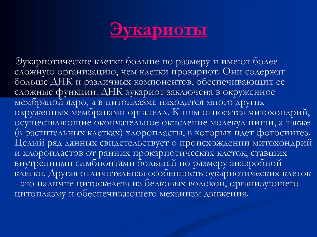 ЭукариотыЭукариотические клетки больше по размеру и имеют более