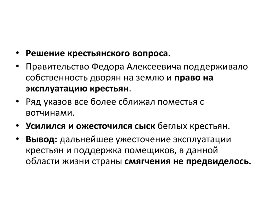 • Решение крестьянского вопроса.• Правительство Федора Алексеевича поддерживало
