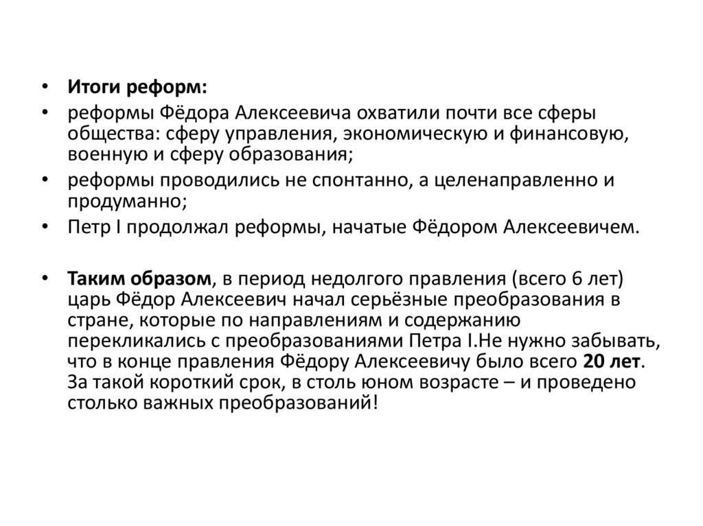 • Итоги реформ:• реформы Фёдора Алексеевича охватили почти все сферы