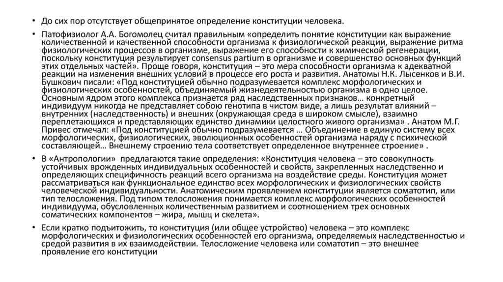 • До сих пор отсутствует общепринятое определение конституции человека.• Патофизиолог А.А. Богомолец считал правильным «определить понятие конституции как выражение