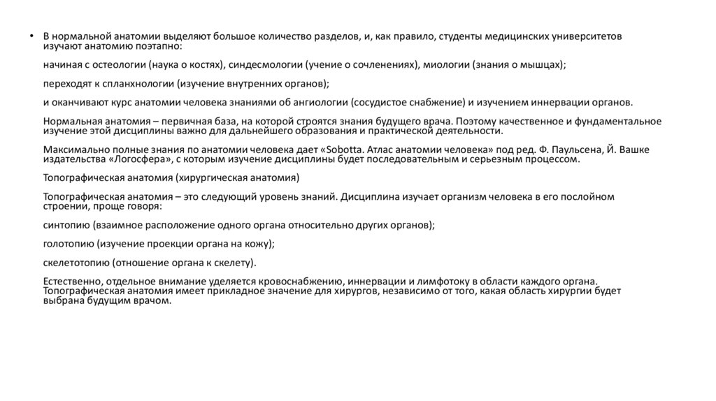 • В нормальной анатомии выделяют большое количество разделов, и, как правило, студенты медицинских университетовизучают анатомию поэтапно: