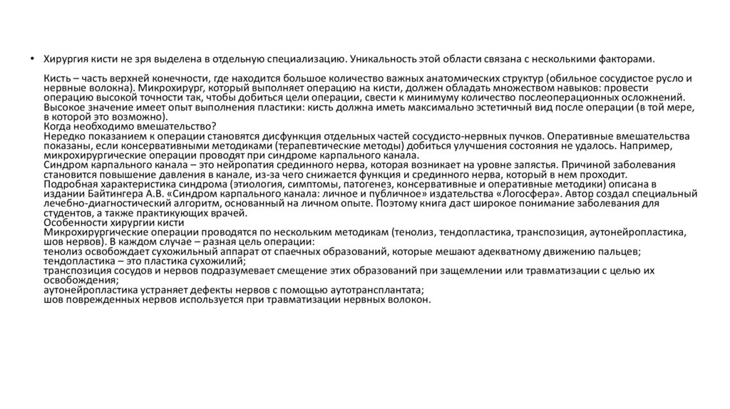 • Хирургия кисти не зря выделена в отдельную специализацию. Уникальность этой области связана с несколькими факторами.Кисть – часть верхней конечности, где находится большое количество важных анатомических структур (обильное сосудистое русло и