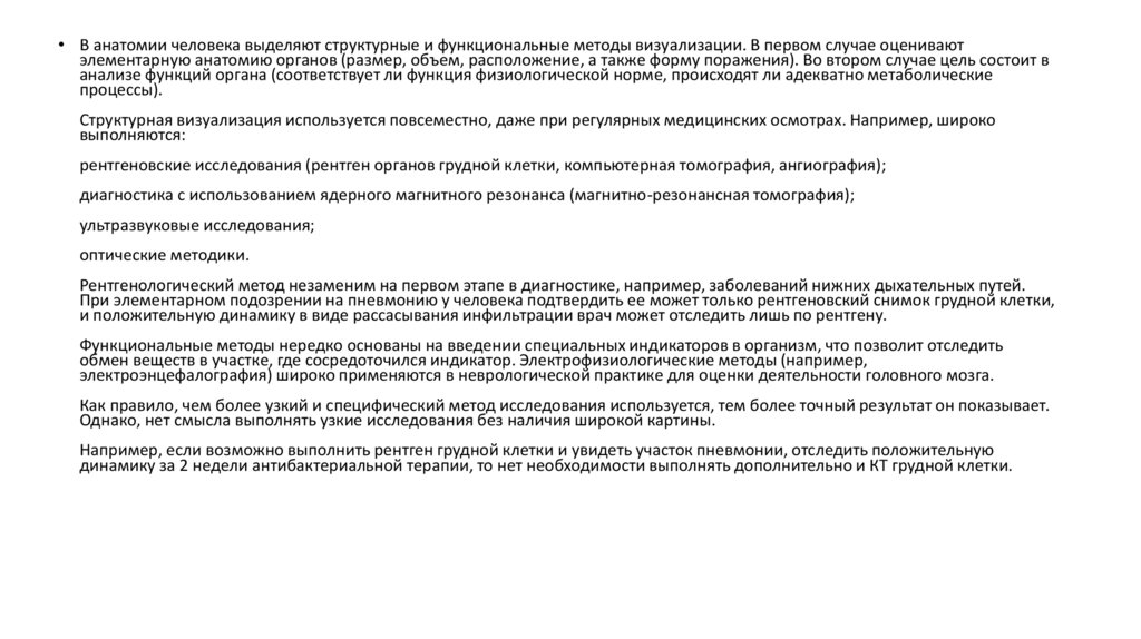• В анатомии человека выделяют структурные и функциональные методы визуализации. В первом случае оцениваютэлементарную анатомию органов (размер, объем, расположение, а также форму поражения). Во втором случае цель состоит в