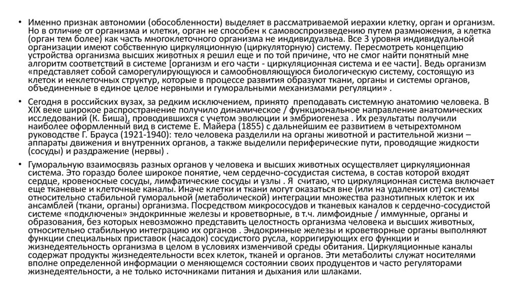 Ткани как системы клеток и системы органов не автономны, включая их циркуляторные связи, и представляют собой