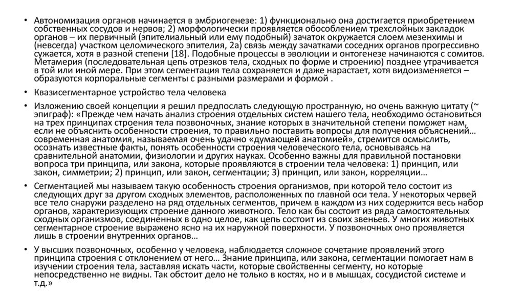 • Автономизация органов начинается в эмбриогенезе: 1) функционально она достигается приобретениемсобственных сосудов и нервов; 2) морфологически проявляется обособлением трехслойных закладок