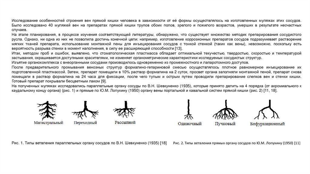 Рис. 2. Типы ветвления прямых органу сосудов по Ю.М. Лопухину (1950) [11]