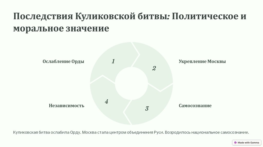 Куликовская битва ослабила Орду. Москва стала центром объединения Руси. Возродилось национальное самосознание.