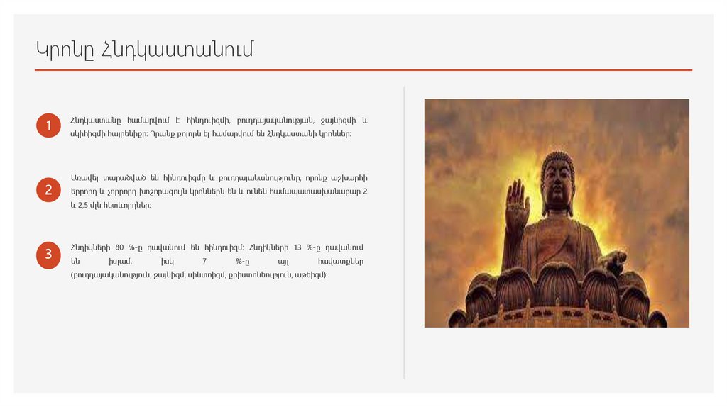 (բուդդայականություն, ջայնիզմ, սինտոիզմ, քրիստոնեություն, աթեիզմ)։