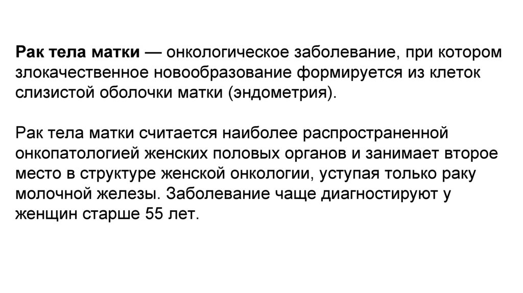 Рак тела матки — онкологическое заболевание, при которомзлокачественное новообразование формируется из клеток