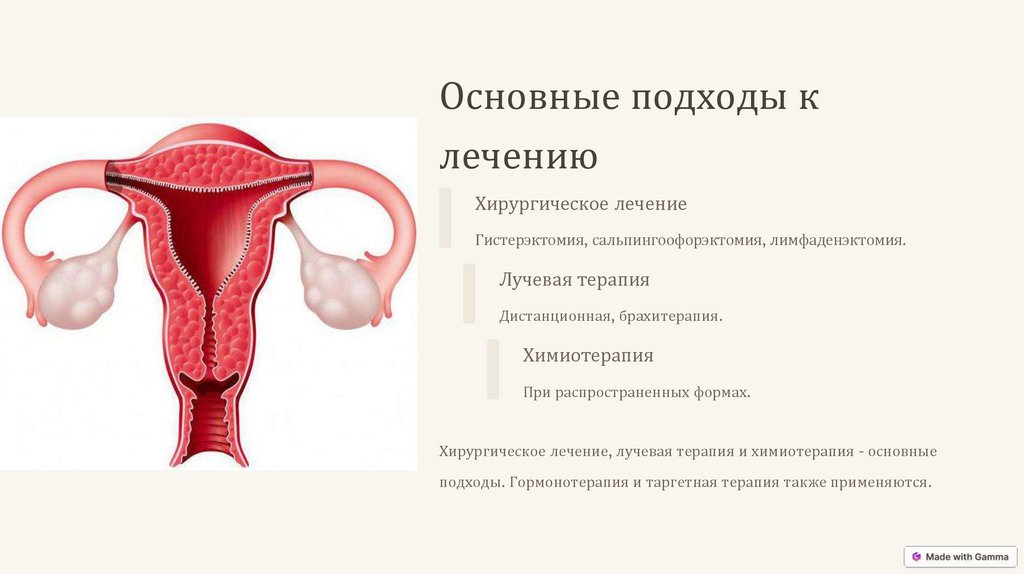 Гистерэктомия, сальпингоофорэктомия, лимфаденэктомия.