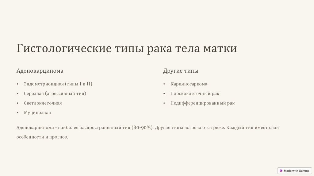 Аденокарцинома - наиболее распространенный тип (80-90%). Другие типы встречаются реже. Каждый тип имеет свои